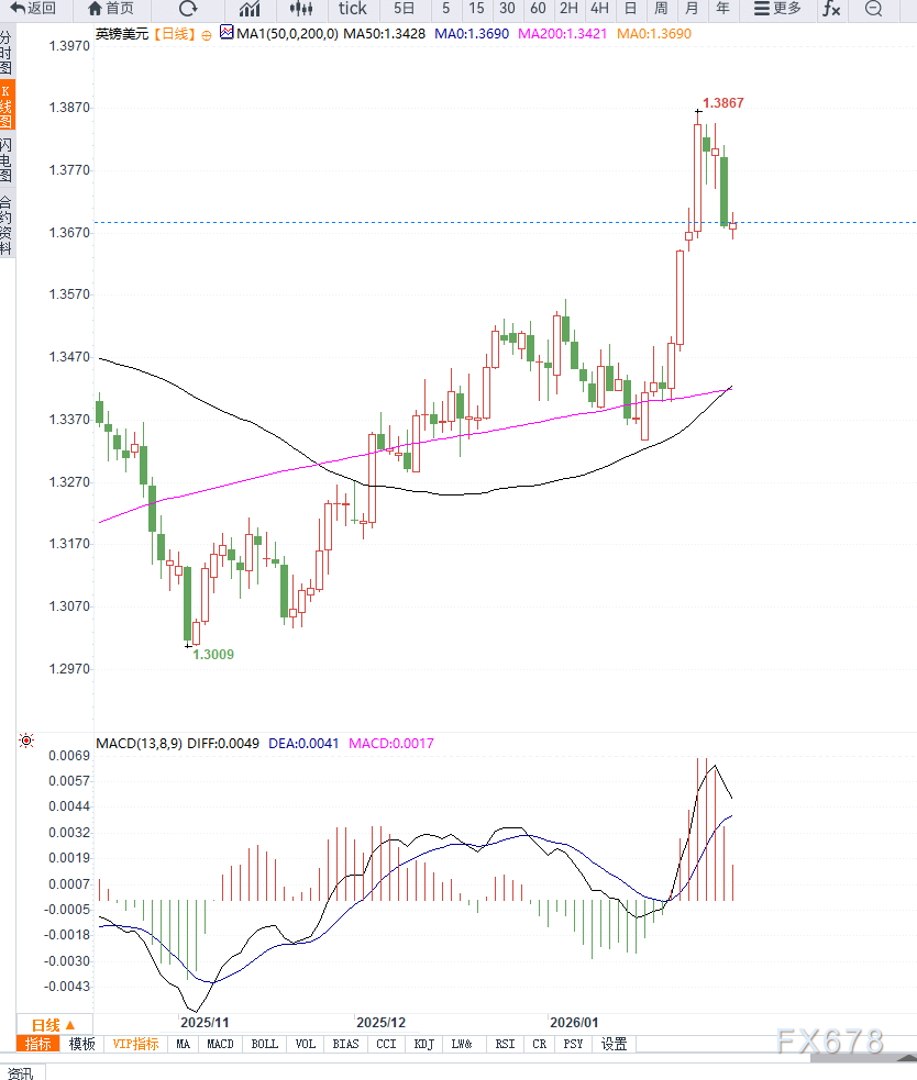 下方支撑位于1.3600附近,一旦跌破该区域,日线结构可能转向更深层次的技术性修正。整体来看,当前走势更符合高位震荡而非趋势反转特征。